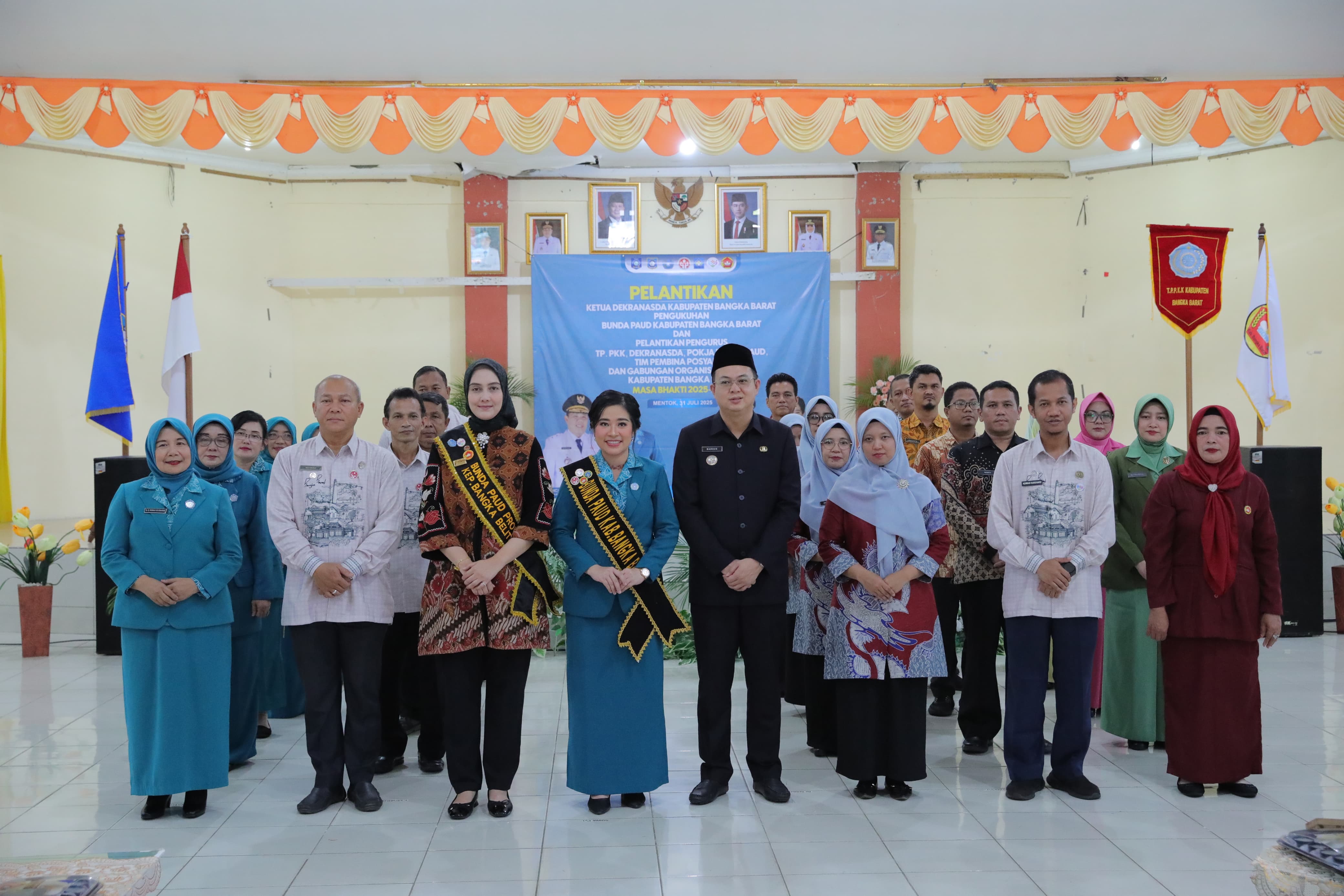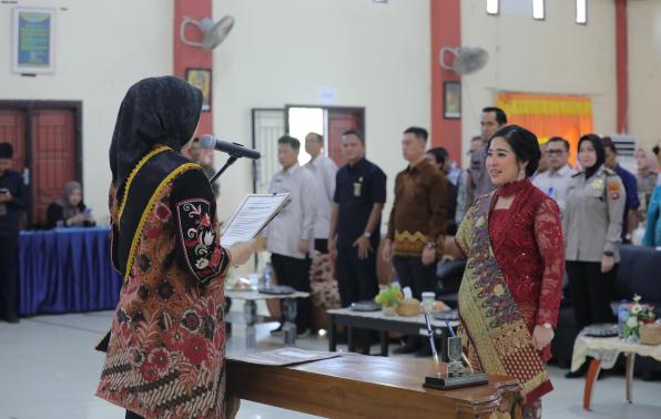 MENTOK - Ketua Dekranasda Provinsi Kepulauan Bangka Belitung (Babel), Noni Hidayat Arsani secara resmi melantik Evi Astura Markus sebagai Ketua Dekranasda sekaligus Bunda PAUD Masa Bakti 2025-2030 Kabupaten Bangka Barat bertempat di Gerha Aparatur Pemda Bangka Barat, Kamis,(31/7/2025).